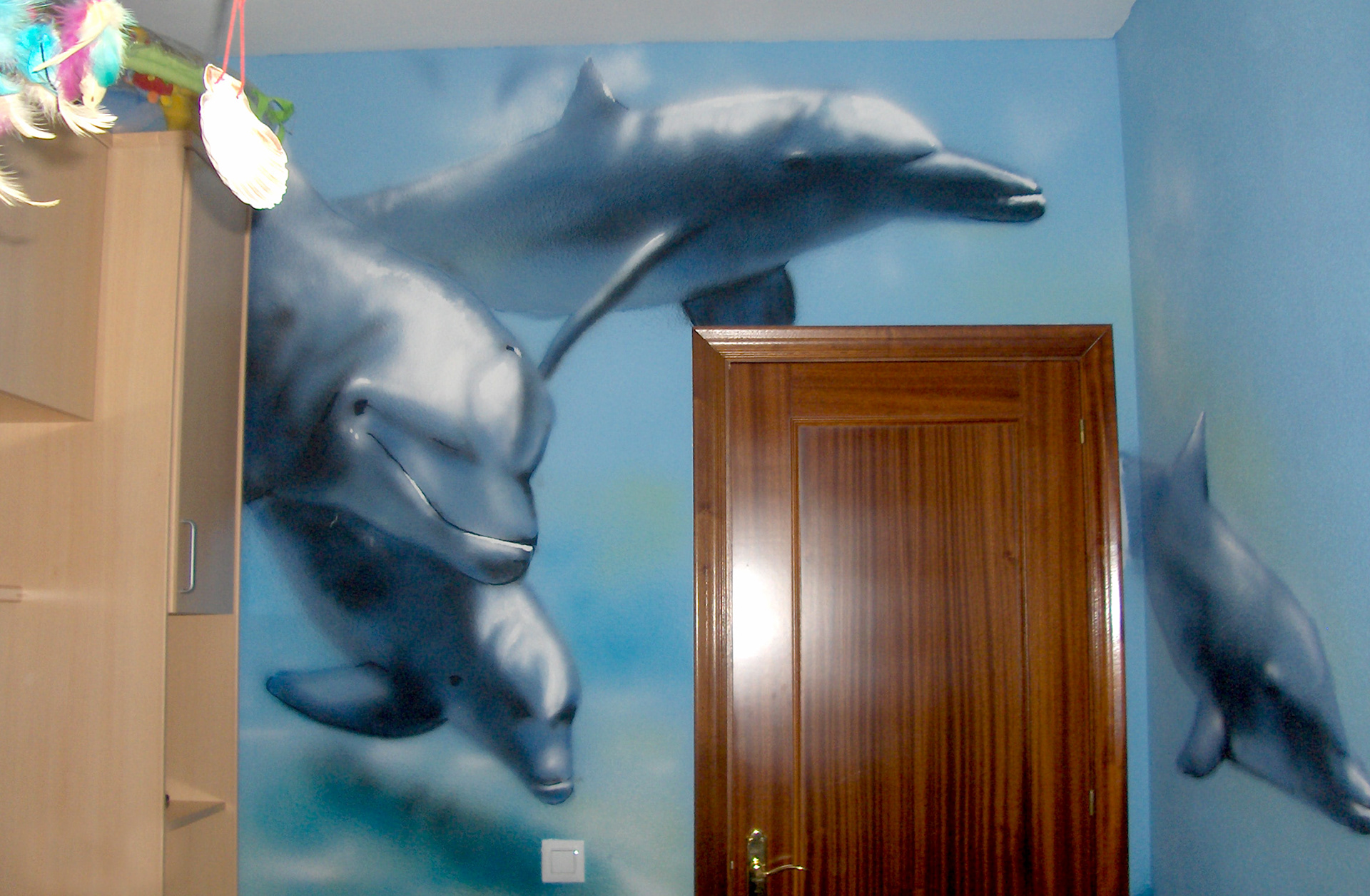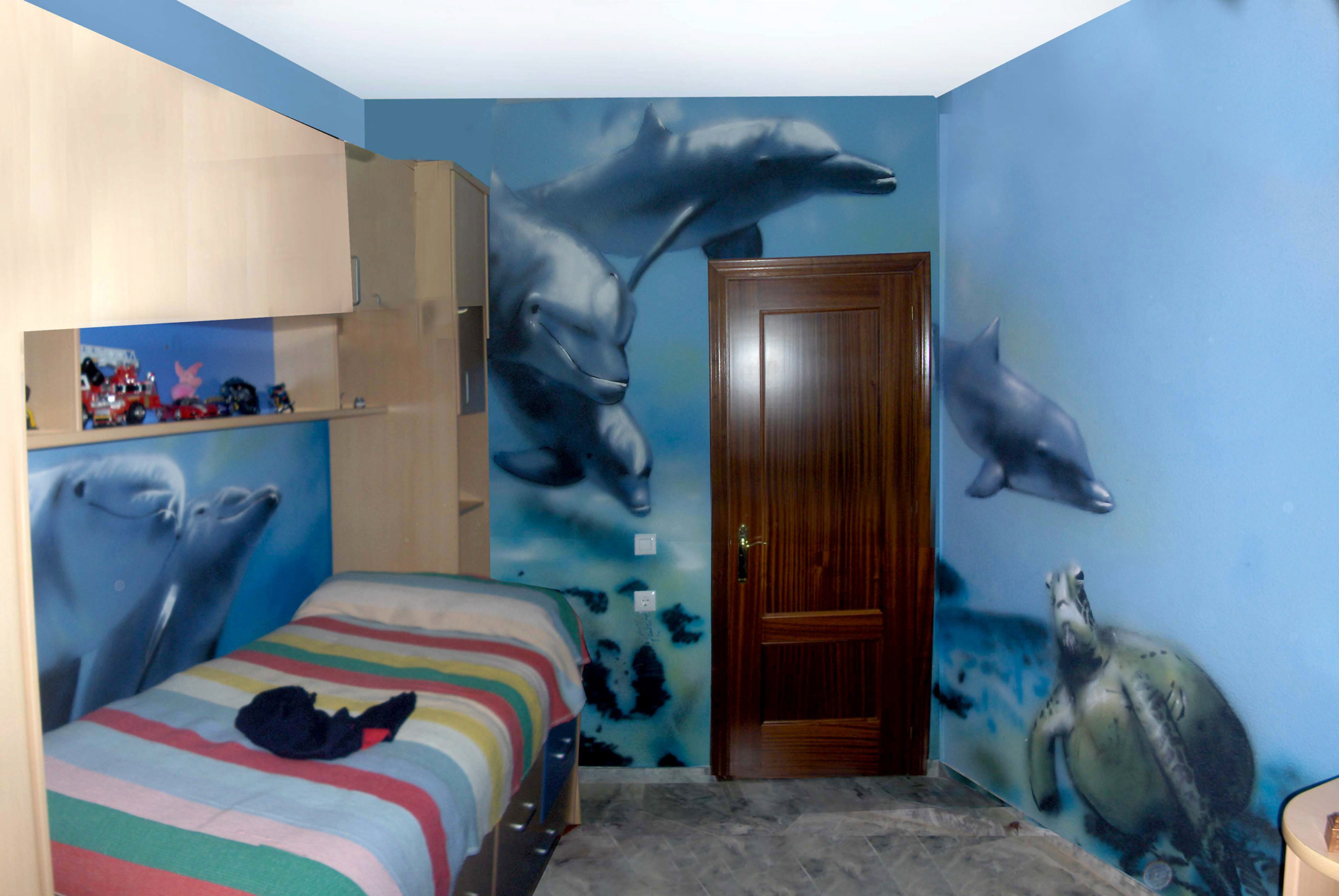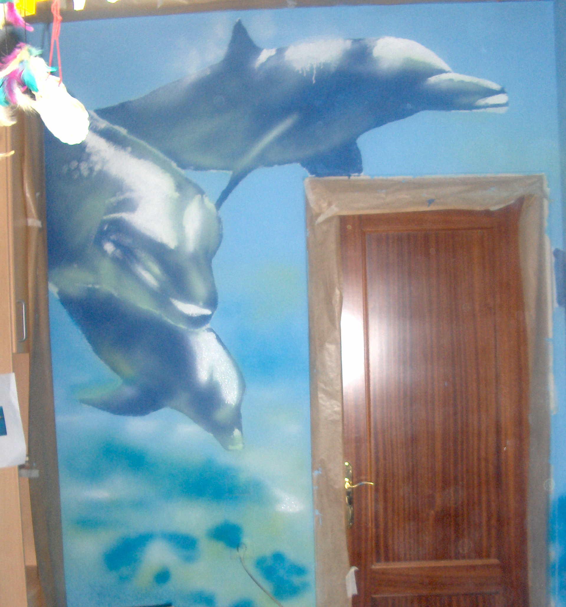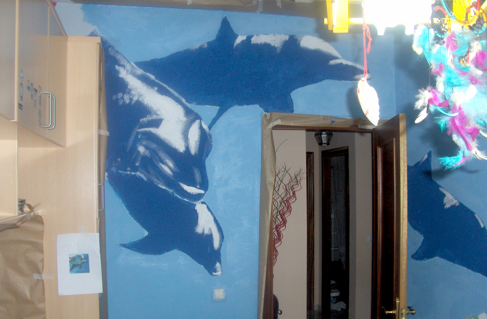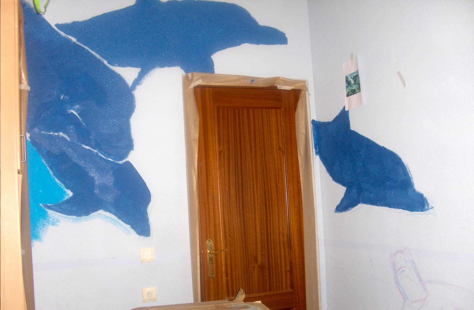 Interior of room. Sprayed acrylic paint and brush.